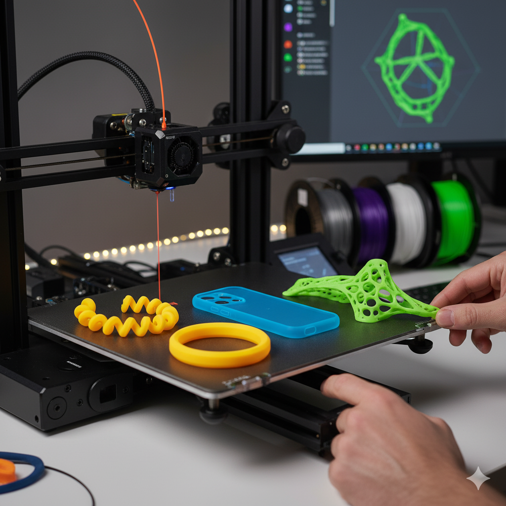 Novos filamentos à base de TPU e elastómeros permitem produzir peças elásticas, resistentes e coloridas, ideais para calçado, acessórios e gadgets.